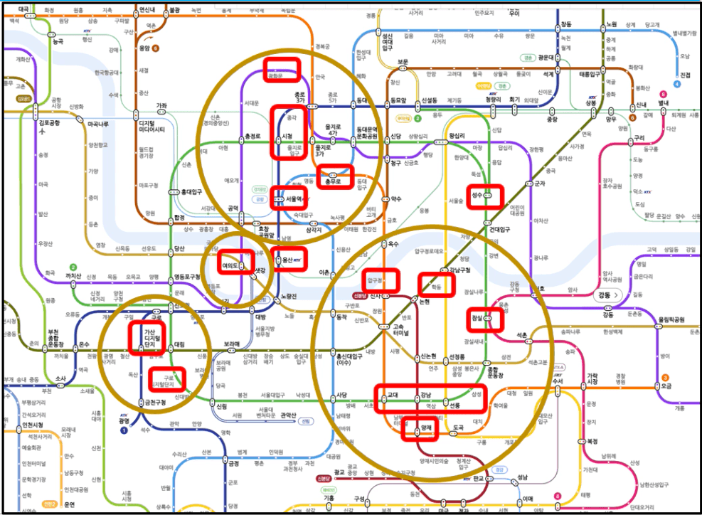 이렇게보면 확 와닿지 않아서 지도에 표시해볼까하다가 지하철 노선도에 직접 표시해보면 가시성이 훨씬 좋겠다고 생각했고 이걸 표현해보았습니다.