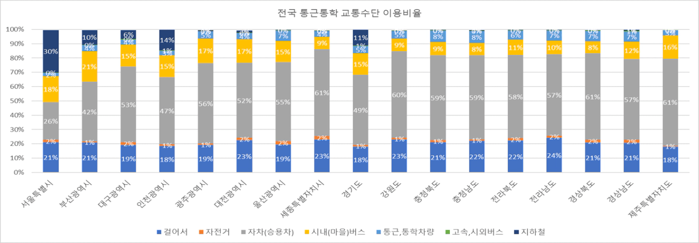 서울의 압도적인 지하철 비율 30%가 보이시나요? 버스를 포함하면 대중교통으로 절반 이상 인구가 2500만명 절반이면 1300만명이 수도권에서 대중교통을 이용한다는 의미잖아요?