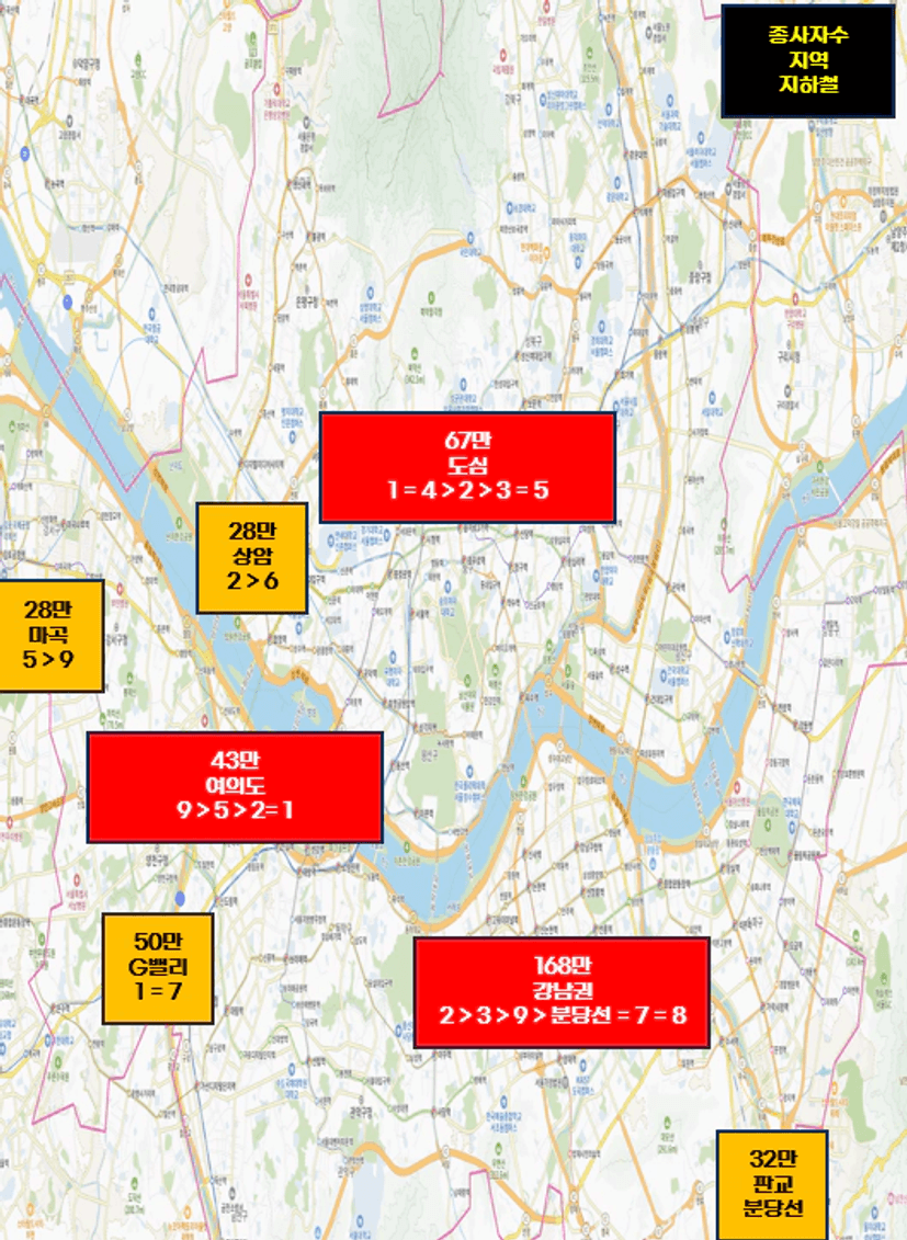 간단하게 표시했지만, 어떠세요? 간접적으로 강남 접근성이 왜 중요한지 아실 수 있겠죠?^^