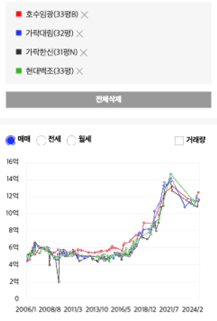 안녕하세요. 송파구의 헬리오시티입주시 주변단지에 미치는 영향에 대해서 알고 싶으셨던것같습니다. 우선 가지고 온 단지를 보면 헬리오시티와이 물리적인 거리 차이가 있는 부분이있습니다. 가락대림이나 가락한신이 훨씬 가깝긴하죠. 실제 공급이 터졌을때 주변의 단지들에 영향이 먼저 가는것은 맞긴합니다. 다만그렇다고 해서, 호수임광에는 영향을 미치지않았고, 방이동 현대백조나 호수임광에는 공급의 영향이 무조건 적었다 라고 단정짓기는 어렵습니다. 아실그래프로만은 알수가 없죠. 그 당시의 매물개수와 매도자의 상황이나 매물의 현상에 따라 전저점이 찍히기도 하고 거래가 없기도 하기때문입니다. 만일 이런영향을더 자세히 보고 싶다고 하시면 헬리오입주전후로 해서 위단지들의 거래가 얼마나 찍혔는지를 보시고, 매매나 전세가의 변화가 얼마나 있었는지를 보시면 좀더 원하시는 부분에 도움이 되시지 않을까 라는생각이 듭니다^^