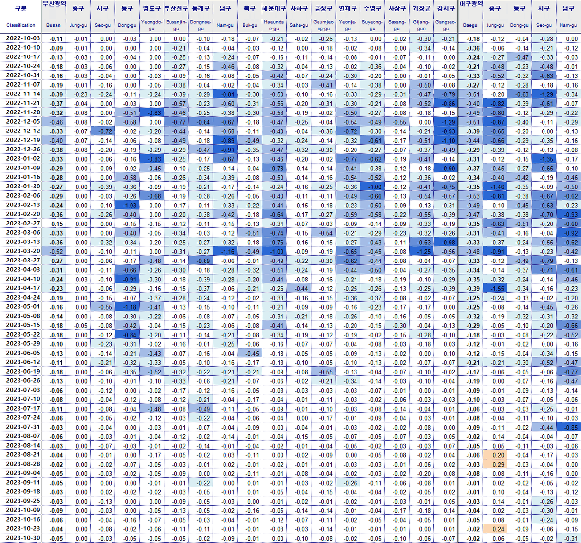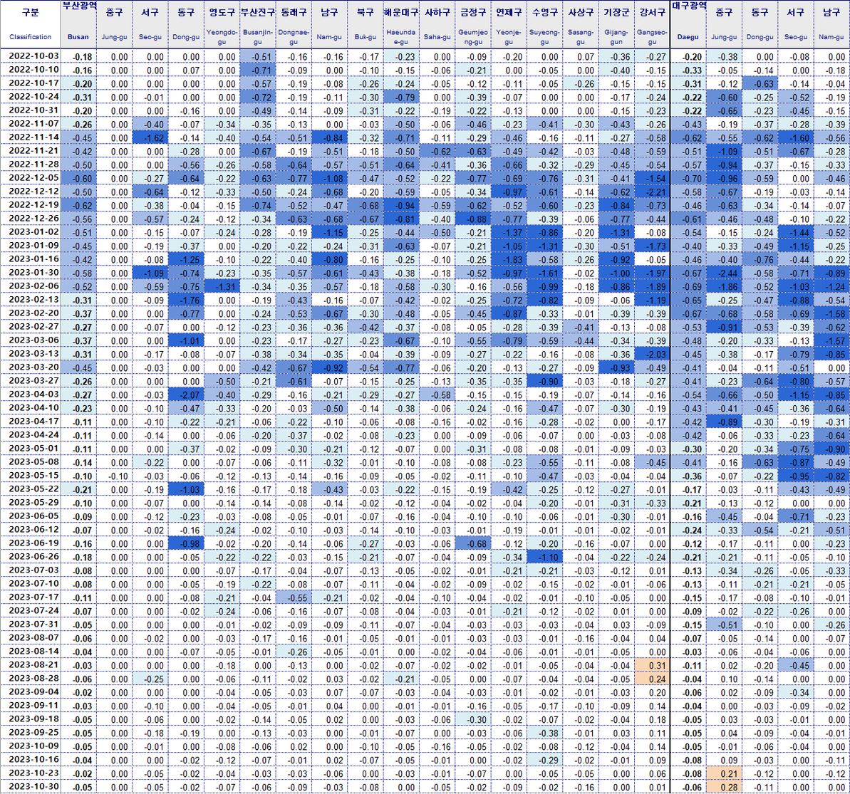 대구 달성군 -0.18% 동구 -0.11%