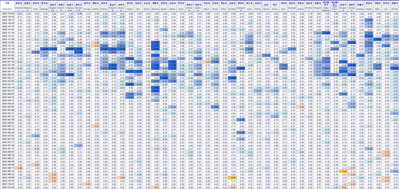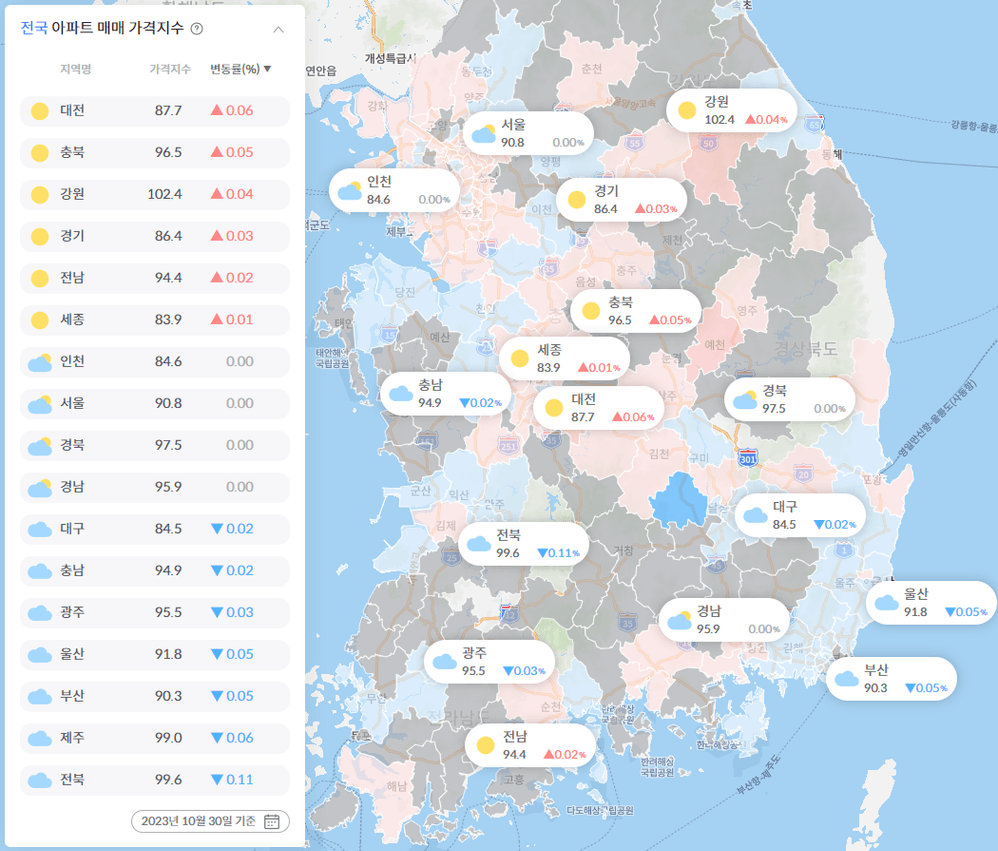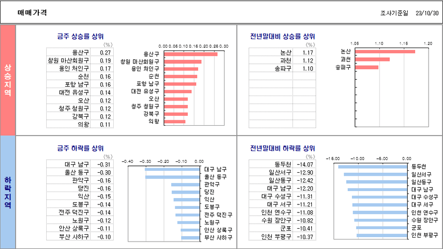 대전이 상승이고 나머지는 하락입니다