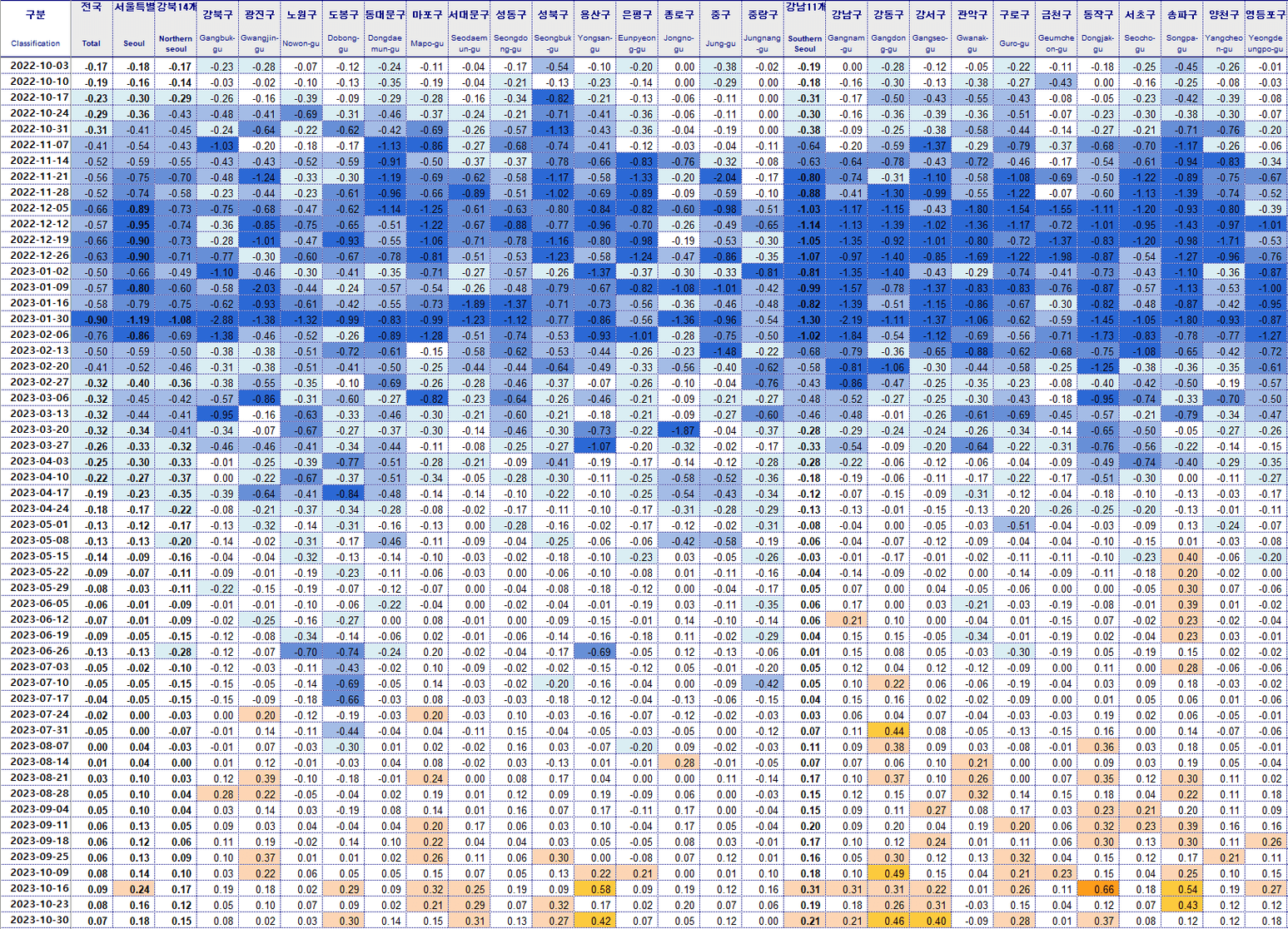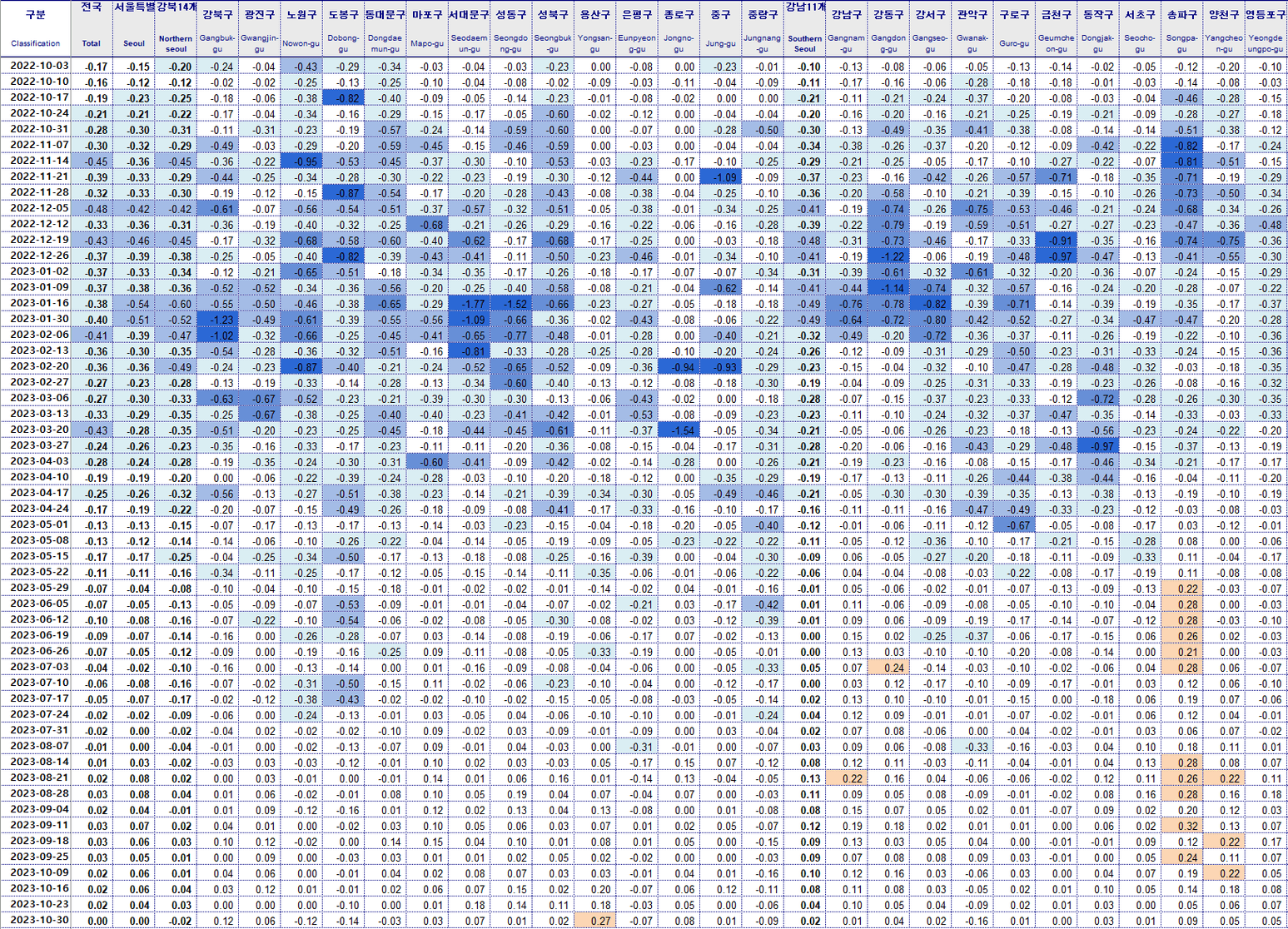 서울 관악구 -0.16% 도봉구 -0.14% 노원구 -0.12%