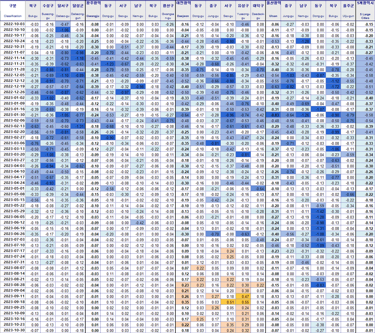 5개 광역시에서는 부산(-0.05%), 대구(-0.02%),