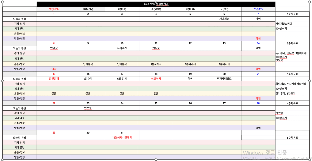 마지막 달은 일정이 더욱 빠듯하기 때문에 정신 안차리면 과제를 못 할수도 있을 것 같아서 좀 더 정신차려서 해야겠습니다.