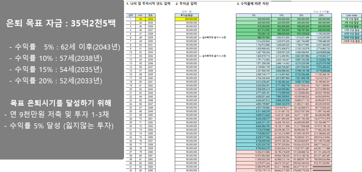 목표 금액 35억 2천5백만(현재 나이 43세, 현시점 투자가용현금 3억/연저축액 9000만원에서 시작)