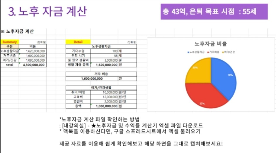 목표 금액 43억 (현재 나이 35세, 연저축액 3400만원에서 시작)