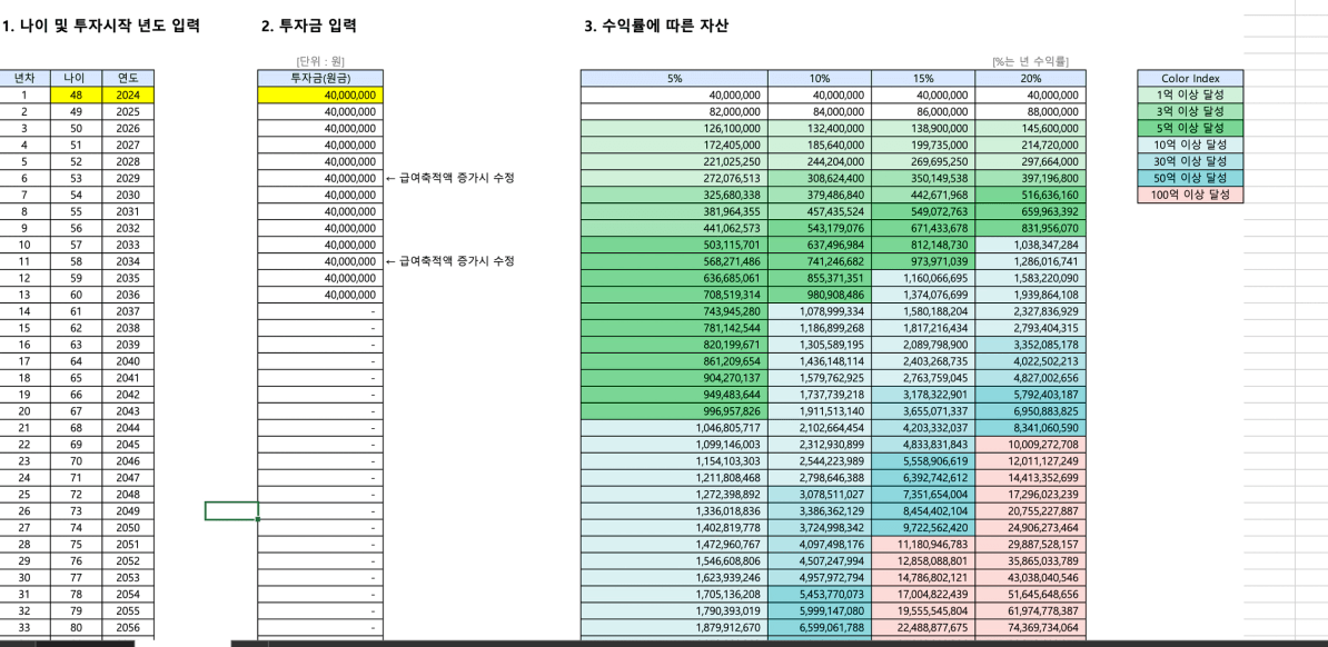 목표 금액 33억 (현재 나이 48세, 연저축액 4000만원에서 시작)