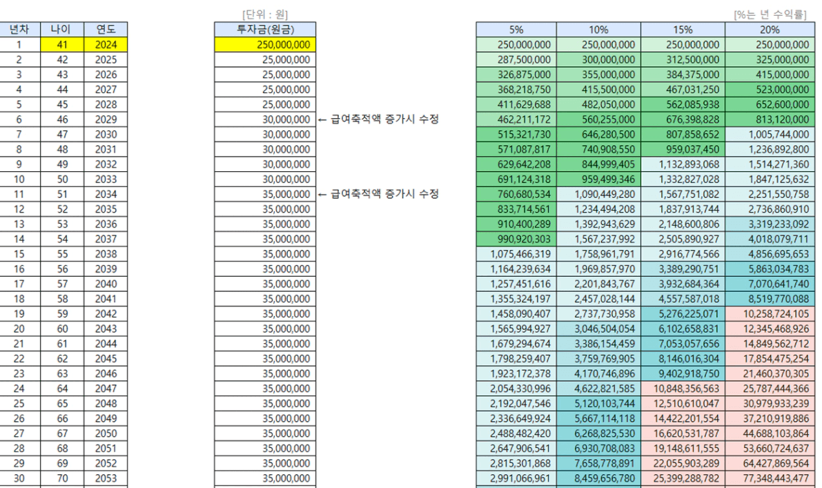 목표 금액 60억 (현재 나이 41세, 연저축액 2500만원에서 시작)