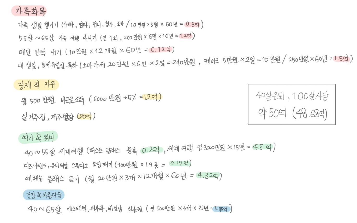 - 가족 생일 챙기기 (아빠, 엄마, 언니, 형부, 조카 / 10만원*5명*60년 = 0.3억)