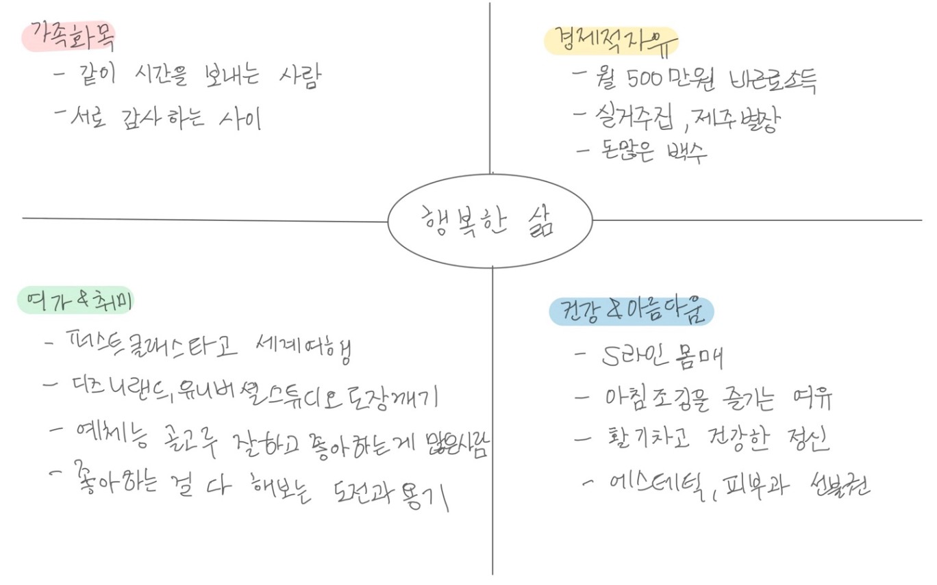 저번달에 ‘결국 해내는 사람들의 원칙’ 책을 읽으며 비전보드를 손으로 적으며 만들어야겠다고 다짐해서 열반스쿨 기초반을 재수강했다. 손으로 적으면서 비전보드를 만들어보니 초수강 때 비전보드를 형식적으로 만들었구나 과제라서 만들었구나를 많이 느꼈다! 손으로 적으니 더 잘 정리되었고 그래서 지금 이젠 난 뭘 해야 하는지가 뚜렷하게 나온 것 같아 기쁘다!!