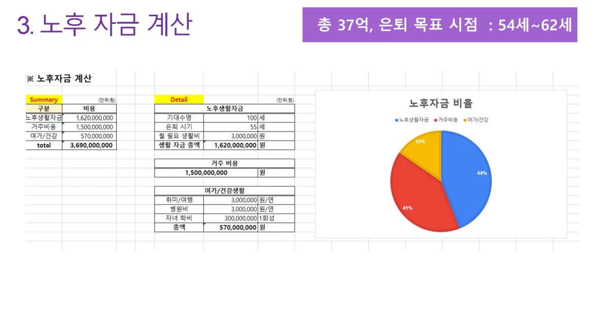목표 금액 36.9억 (현재 나이 38세, 연저축액 3000만원에서 시작)