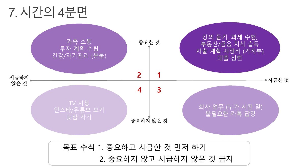 - 투자: 고정지출 재정비 (급여, 이자, 저축 등 정리), 열반 기초반 수강