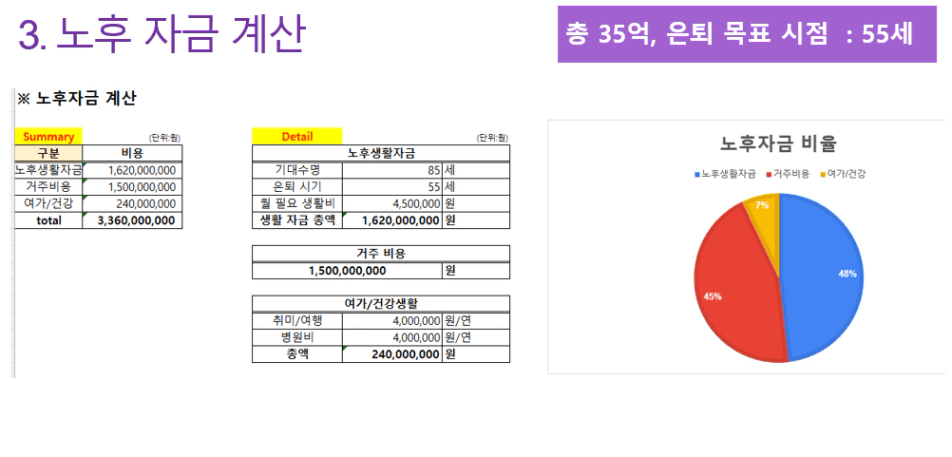 목표 금액 35억 (현재 나이 33세, 연저축액 3000만원에서 시작)