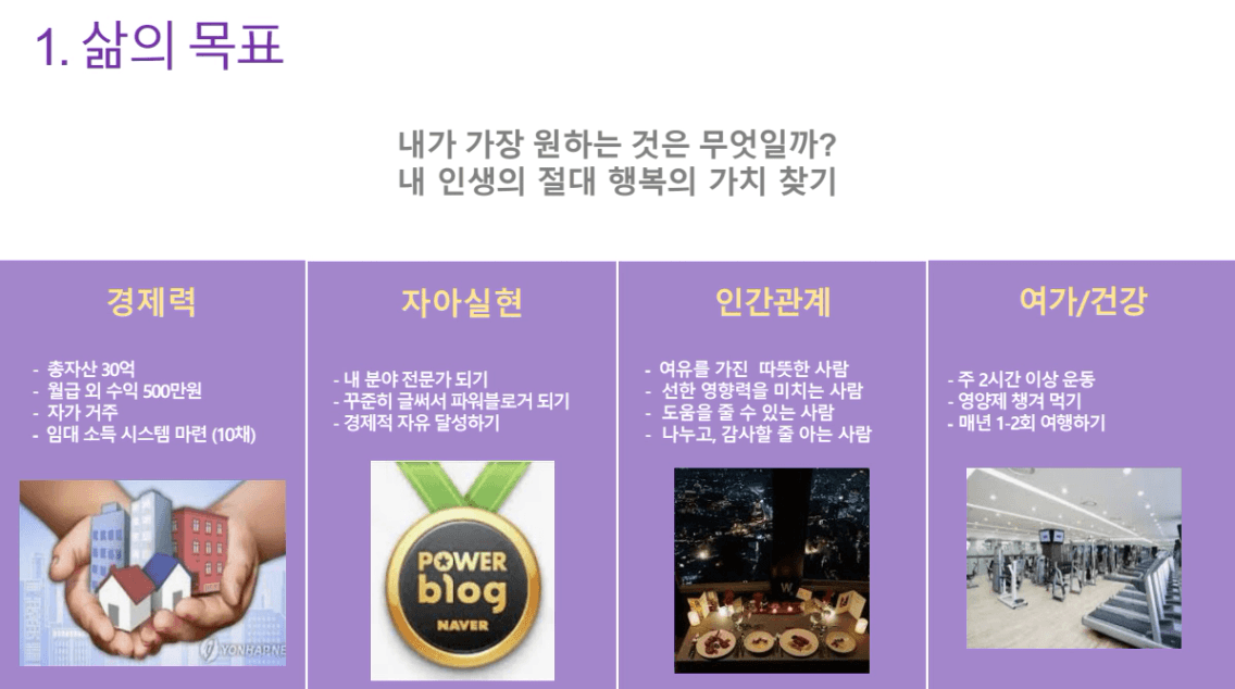 제 인생강의인 열기에서 가장 중요한 하나를 뽑으라면 바로 이 비전보드이더라구여. 앞으로도 두고두고 이정표가 되어줄 비전보드 내용 그대로 모두 이루시길 응원할게여!!홧팅!!