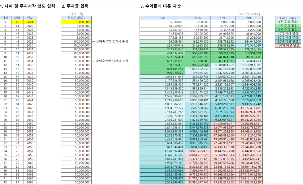 목표 금액 258억 (현재 나이 43세, 연저축액 5000만원에서 시작)