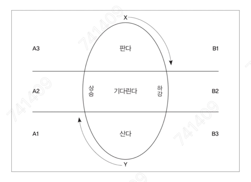 증권심리학 #코스톨라니의 달걀 : 강세장과 약세장은 크게 세 가지 국면으로 구분된다. - 조정국면 - 적응국면 혹은 동행국면 - 과장국면 : A1=조정국면(거래량도 적고 주식 소유자 의 수도 적다) A2=동행국면(거래량과 주식 소유자의 수 가 늘어난다) A3=과장국면(거래량이 폭증하고 주식 소 유자의 수도 증가하여 X에서 최고점을 찍 는다) B1=조정국면(거래량이 감소하고 주식 소 유자의 수가 서서히 줄어든다) B2=동행국면(거래량은 증가하지만 주식 소유자의 수는 계속 줄어든다) B3=과장국면(거래량은 폭증하지만 주식 소유자의 수는 감소하여 Y에서 최저점을 찍는다) : A1 국면과 B3 국면에 이르면 매수한다. A2 국면에서는 기다리거나 보유한 주식을 계속 유지한다. A3 국면과 B1국면에 이르면 매도한다. B2 국면에 이르면 기다리거나 현금을 보 유한다.