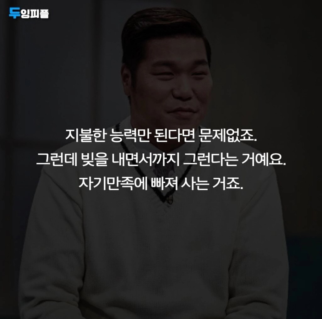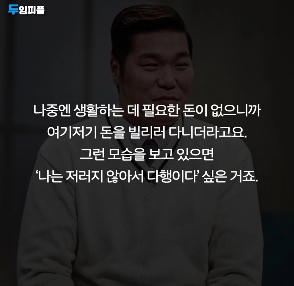 자기만족이라는 이유들로 대출을 받아가면서 살아가다 보면 결국에 나이가 들어서 처참해지고 주변 사람들에게도 아쉬운소리를 할 수 밖에 없는 것 같아요