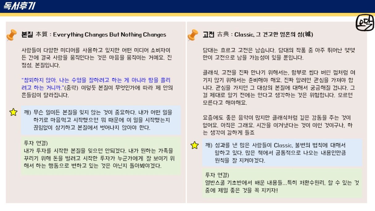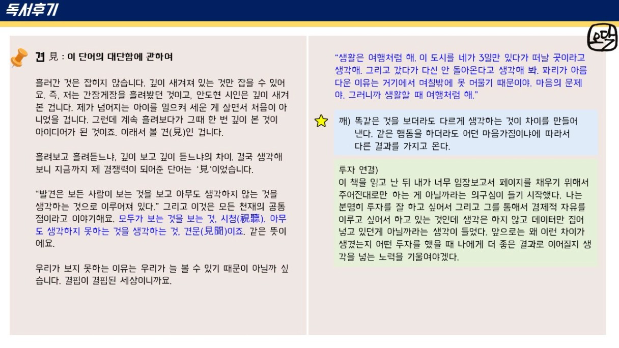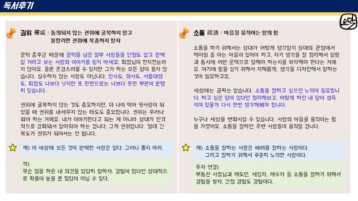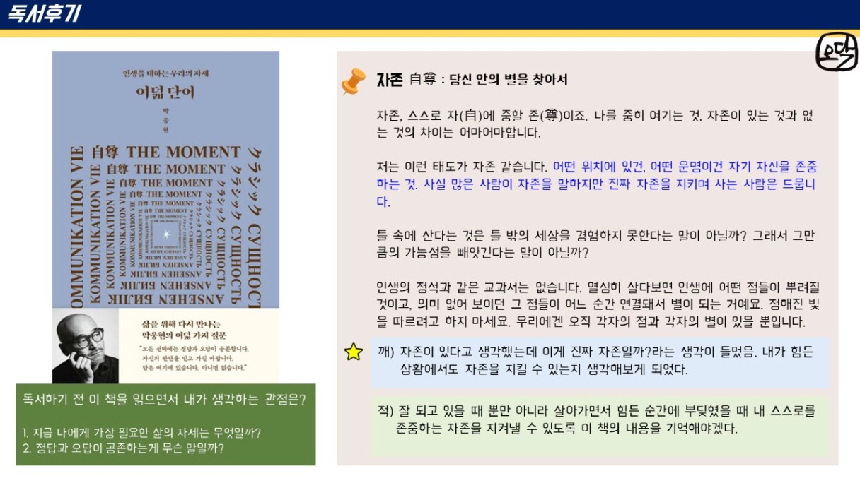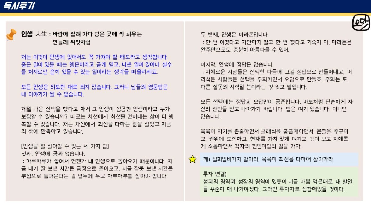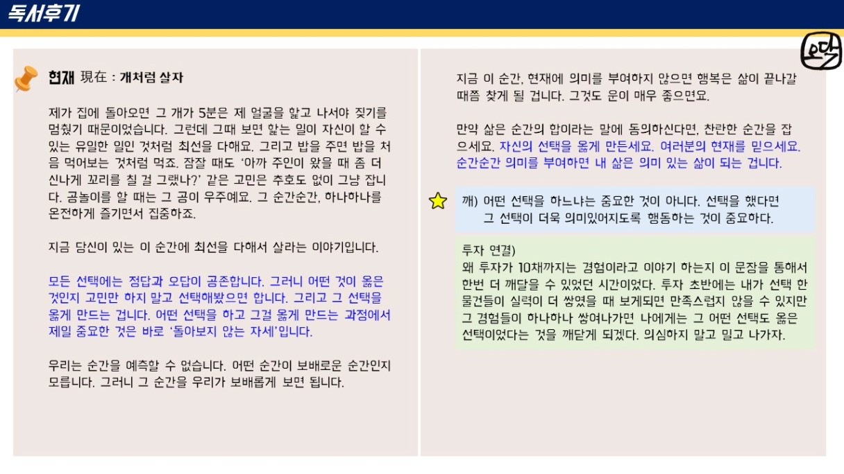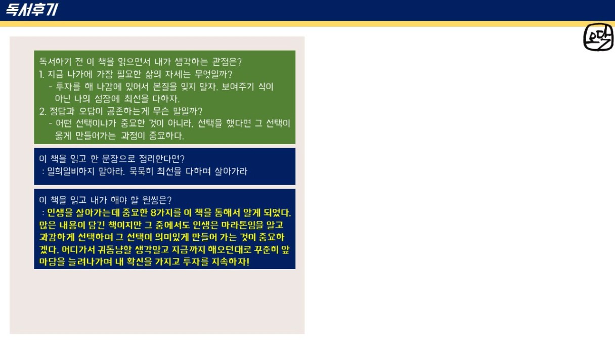 오닥 조장님~ 후기가 또 하나의 책이네요~!! 앞으로도 꾸준한 앞마당 늘려가기 응원합니다~!!