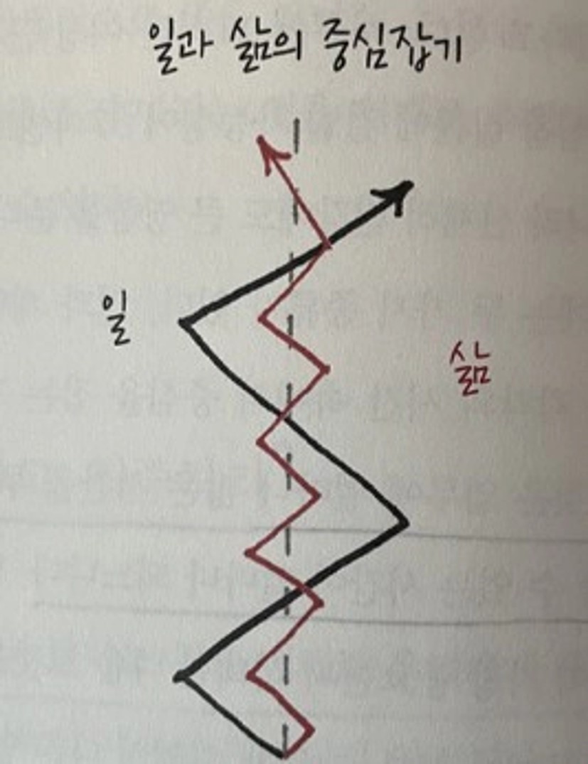 ⇒ 원씽에서 봤던 아래의 그림이 생각나는 구절이었다. 5:5 완벽한 균형이 아니라 그때 그때 상황에 따라 조율해 가는 것이 삶이라는, 같은 메세지를 다시 한 번 새겼다.