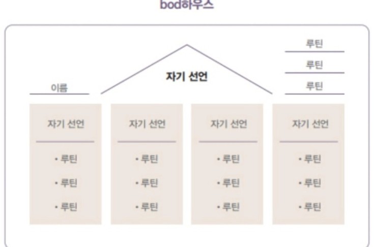 ‘bod하우스’ 1개의 지붕과 4개의 기둥으로 이루어져 있다. 자신이 중요하게 생각하는 삶의 섹션을 정한 뒤 가장 시급하고 중요한 것은 지붕에, 나머지 섹션들은 기둥에 배치한다. 그리고 각각의 섹션마다 주기적으로 반복할 루틴을 적는다.bod하우스를 그려야 내가 지금 어떤 하루를 살고 있는지, 어떤 하루를 살고 싶은지가 한눈에 보인다.