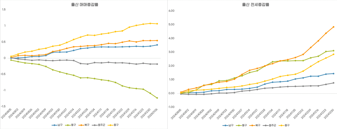울산(남구,중구,북구,동구,울주군) 에서 상승의 모습을 보여주며,