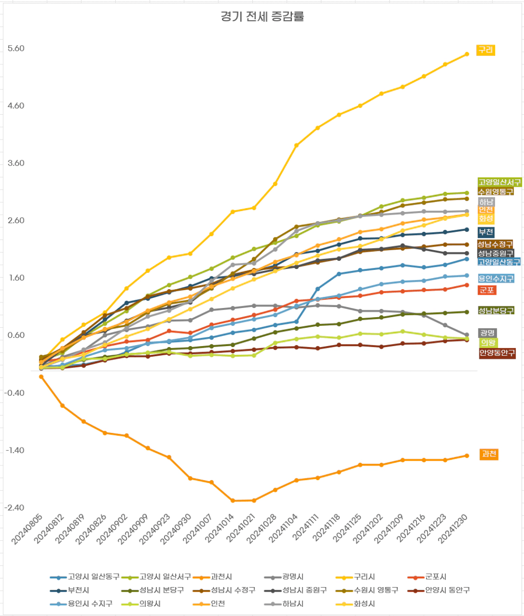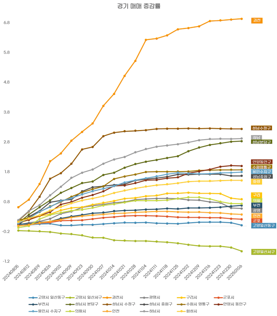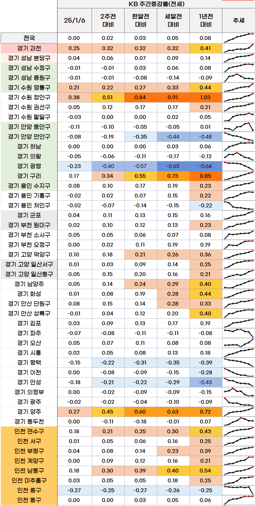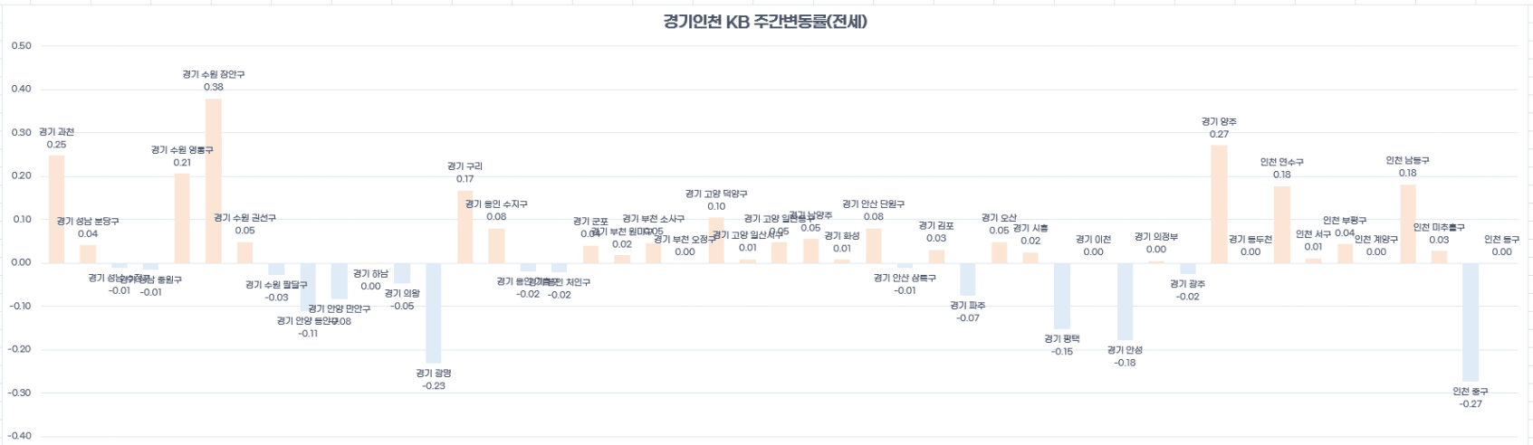 과천, 수원장안, 수원영통, 구리 등에서는 전주 대비 높은 상승을 보입니다.