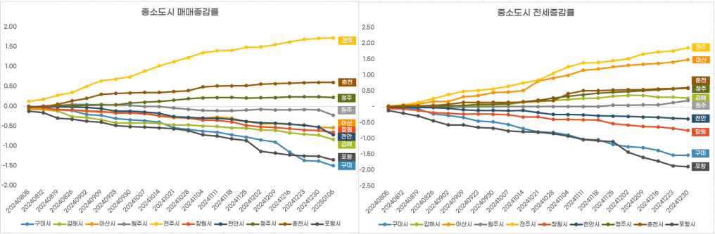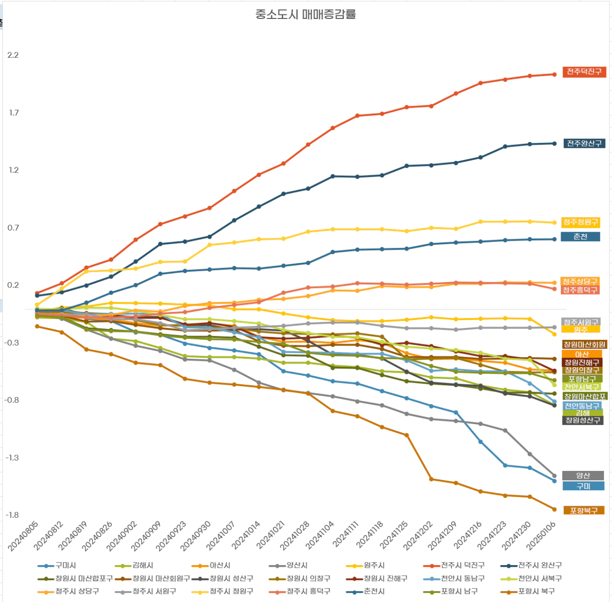 천안, 양산에서 두드러진 하락을 보여줍니다.