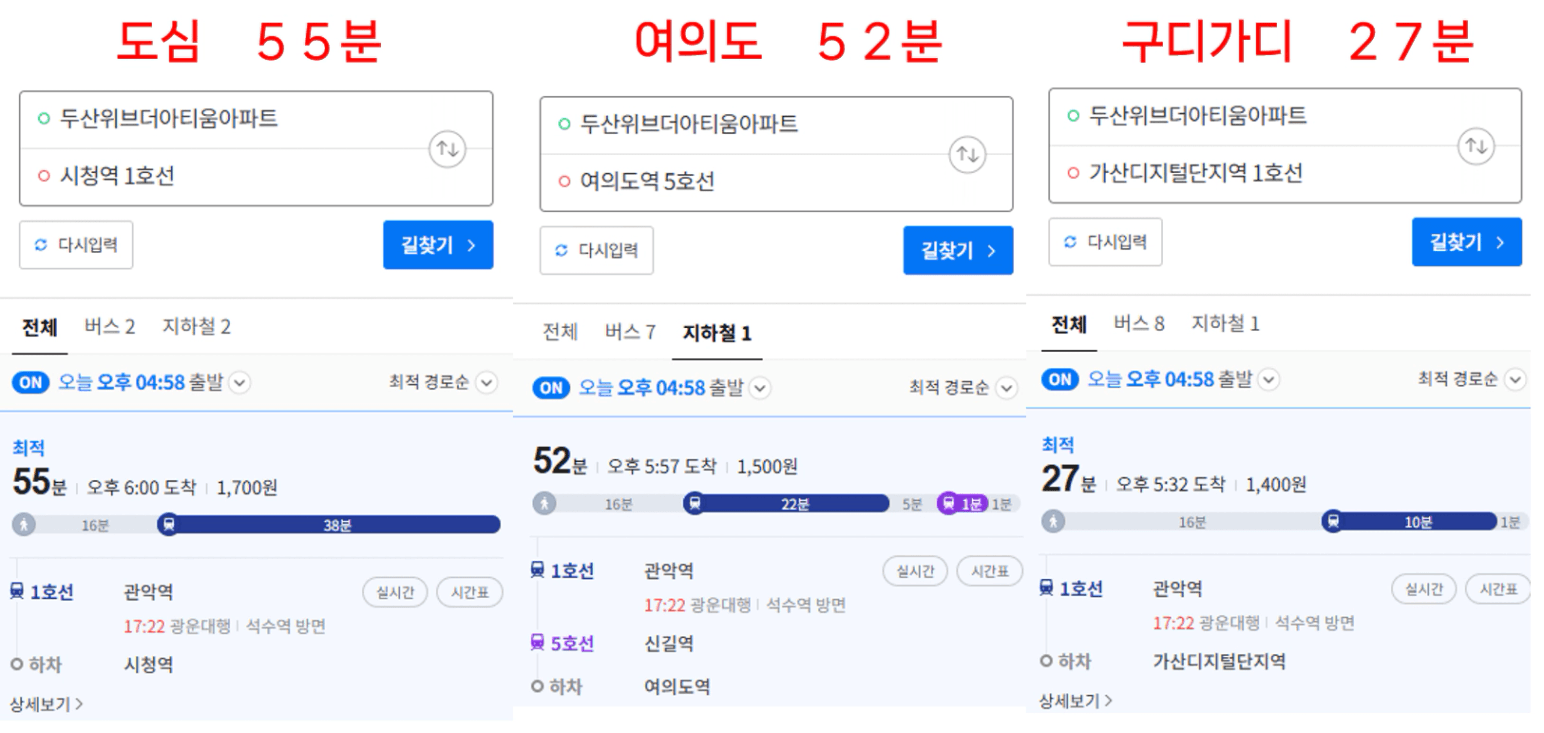 그외에도 도심업무지구와 여의도 업무지구까지는 50분