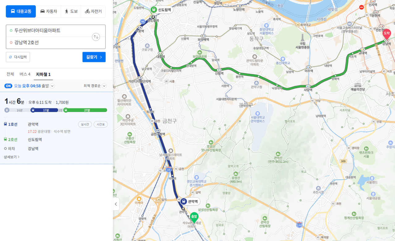 단지~ 강남역을 찍었을 때 1시간 6분이 걸려