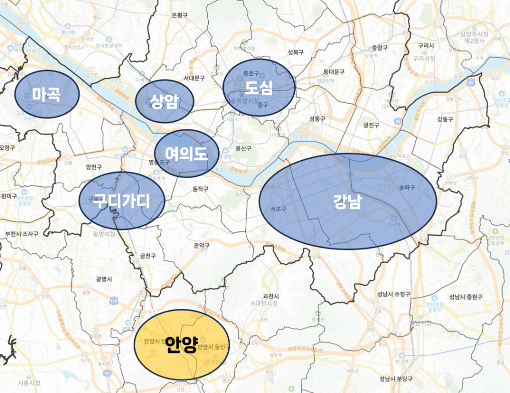 강남, 여의도 업무지구도 접근하기 좋은 위치에 있어요.