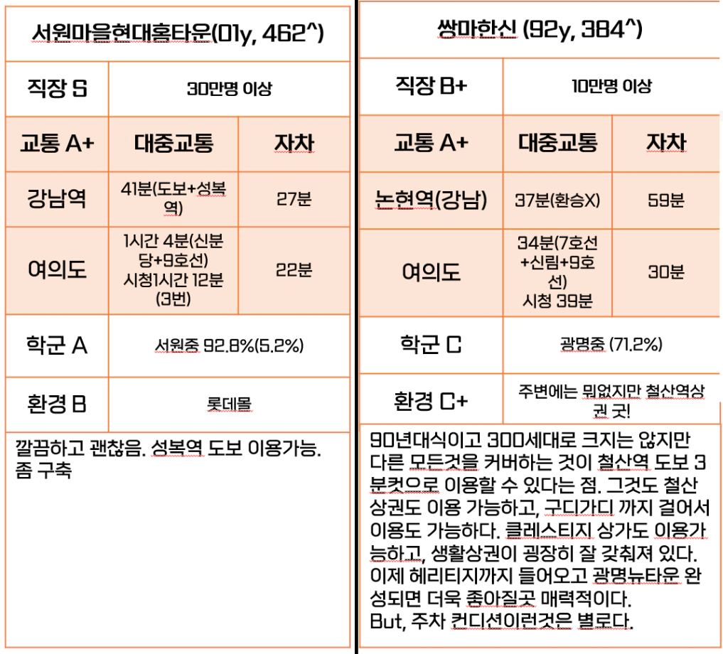 안녕하세요 로이님~ 광명 철산동과 수지 서원마을현대홈타운을 비교평가 해주셨군요! 입지요소로 비교평가 잘 해주신 것 같아요~ 여기에 각 지역 내에서 해당 단지들의 선호도가 어느 정도인지, 그 생활권 사람들이 얼마나 좋아하는 곳인지 정성적인 체크도 해보시면 좀 더 좋을 것 같아요~ 수도권이라고 해서 사람들이 교통만 보고 집을 결정하는 것은 아니고 부동산 여러 가지 요소를 복합적으로 고려해야 하는 것 같아요 ㅎㅎ 실제 투자를 진행하게 된다면 투자금, 더 싸진 곳은 어디인지, 공급이 많아지는 지역이라면 그 안에서 이 구축의 수요가 꾸준히 있을지 등등 다양하게 고려하고 매물 대 매물로 볼 것 같아요! (참고로 쌍마한신은 강남역은 아니더라도 7호선 고속터미널, 강남구청과 30분 이내로 갈 수 있어요!)