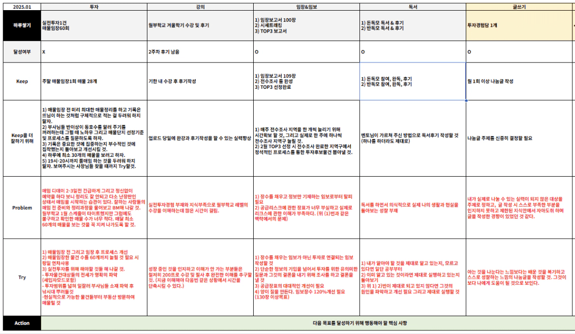 제대로 된 틀로 전수조사를 시작한 것, 몰입해서 비교평가하고 임장지에서 1등을 뽑아낸 것, 아직도 많이 부족하지만 임보에서 실전반 보다 양과 질에서 더 나은 결과물을 낸 것, 투자하기까지 채워야 할 것들을 인지한 것, 프로세스를 보다 뚜렷하게 인식한 것, 부족한 시간 속에서도 무너지지 않고 긍정적인 마음으로 해 나간 것, 의자에서 자 본 것, 자고 싶은 욕구를 미친 듯이 느껴본 것, 삭아가는 얼굴 보며 태어나서 최고의 노력을 멈춤 없이 해본 것, 스스로의 한계를 늘린 것, 어슬프지만 나눔글 작성해본 것.