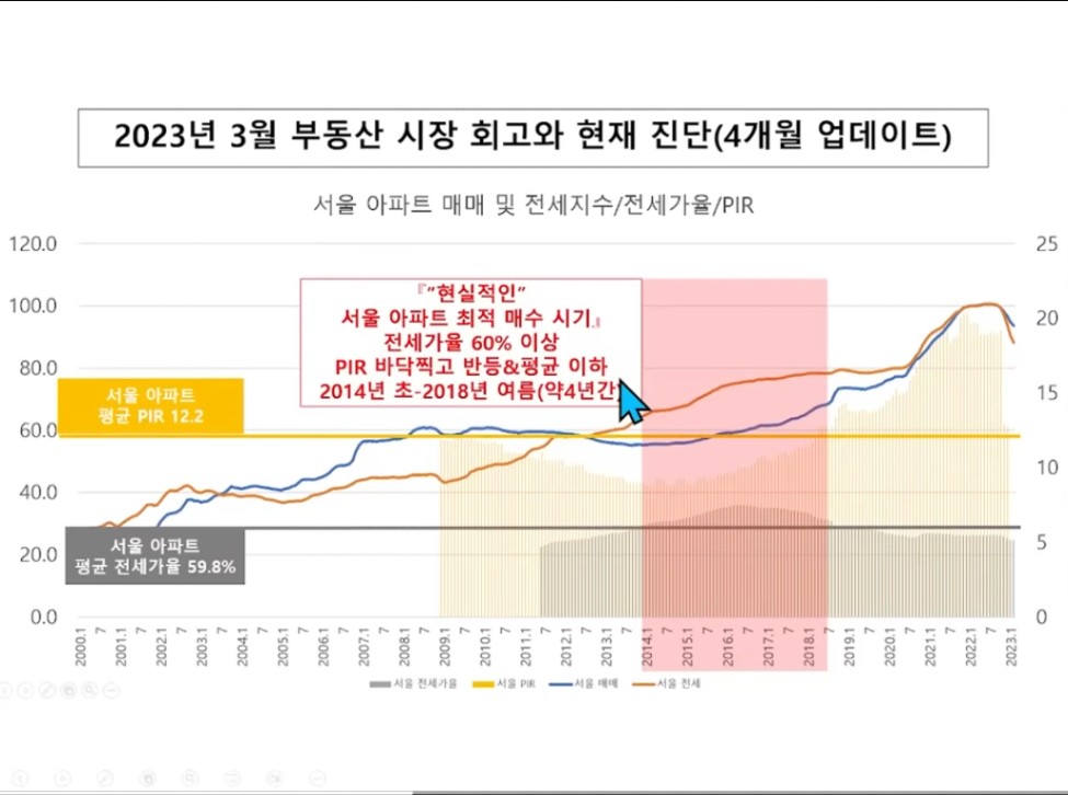 “강남권에 대규모 아파트 단지가 등장했다고 해도 서울시 전체 입주 물량이 역대 평균 대비 적다면, 강남권 전세가격은 단기간(3~6개월) 하락할지라도 서울시 전체 차원의 전세가격은 상방 압력을 받게 된다. 2023년 현재 많은 사람들이 심각하게 느끼지 못할 수 있으나, 서울 전체의 전세가격이 슬금슬금 오르는 지금의 상황은 매우 우려되는 신호이다.”