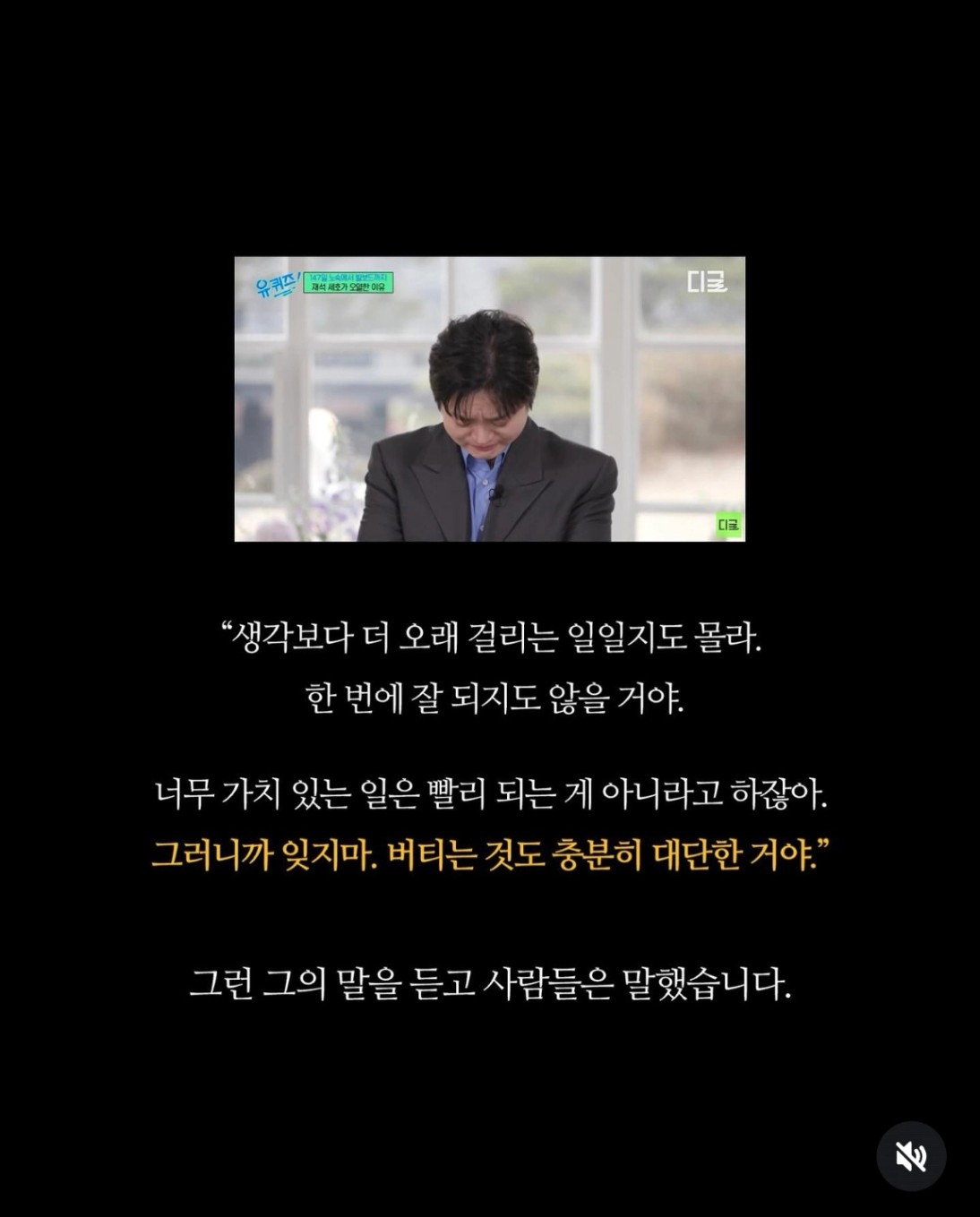 14년이라는 긴 무명의 시절을 버틸 수 있었던 이유는 너무 가치 있는 일은 빨리 되는게 아니기 때문에 그저 버티는 것만으로도 충분하다고 이야길 했는데요