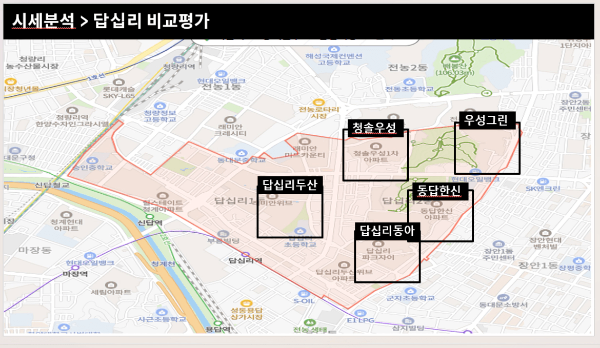 총 5군데 청솔우성, 우성그린, 답십리두산, 동답한신, 답십리동아로 비교평가 단지를 선정했다.
