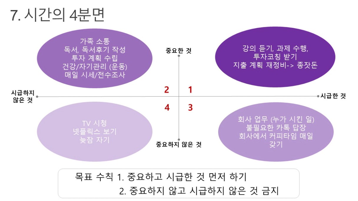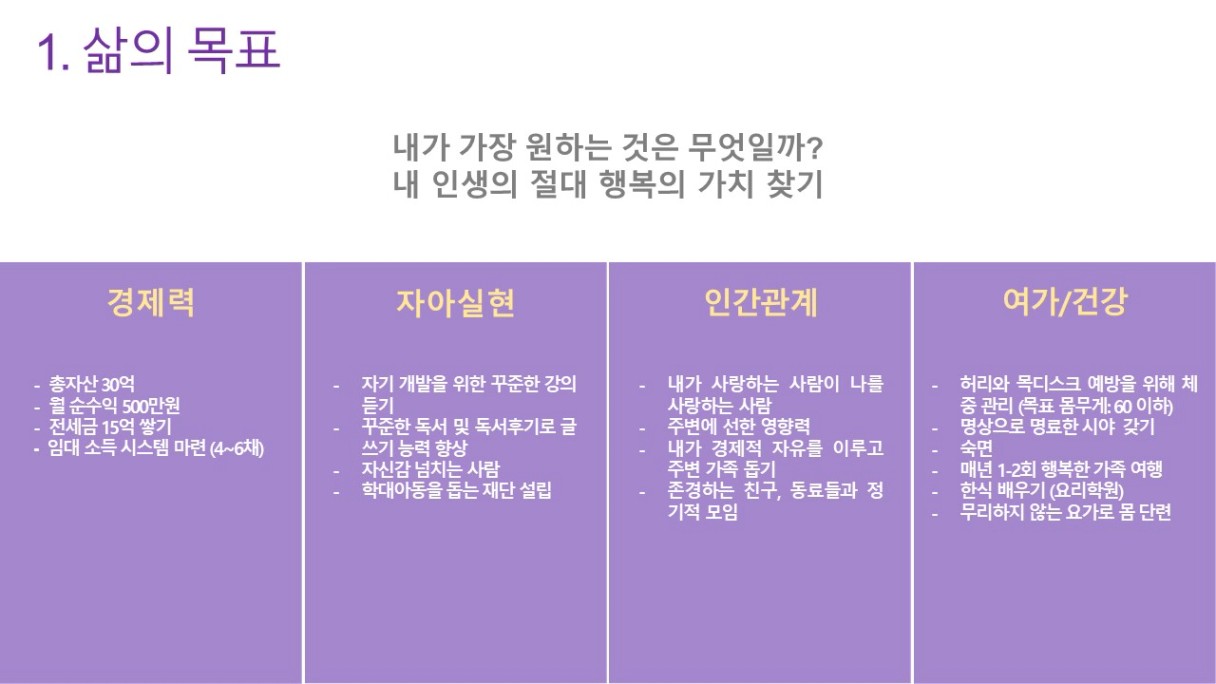 - 인간관계: 동료 글에 댓글달기 하루 5개 이상, 주말은 고3아이 챙기기