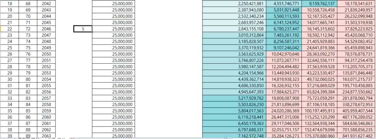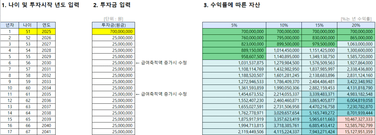 목표 금액 21억 (현재 나이 51세, 연저축액 2500만원에서 시작)