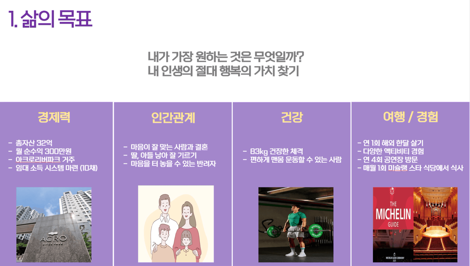 위에서 그려본 꿈꾸는 인생 목표를 구체적으로 적어보세요.