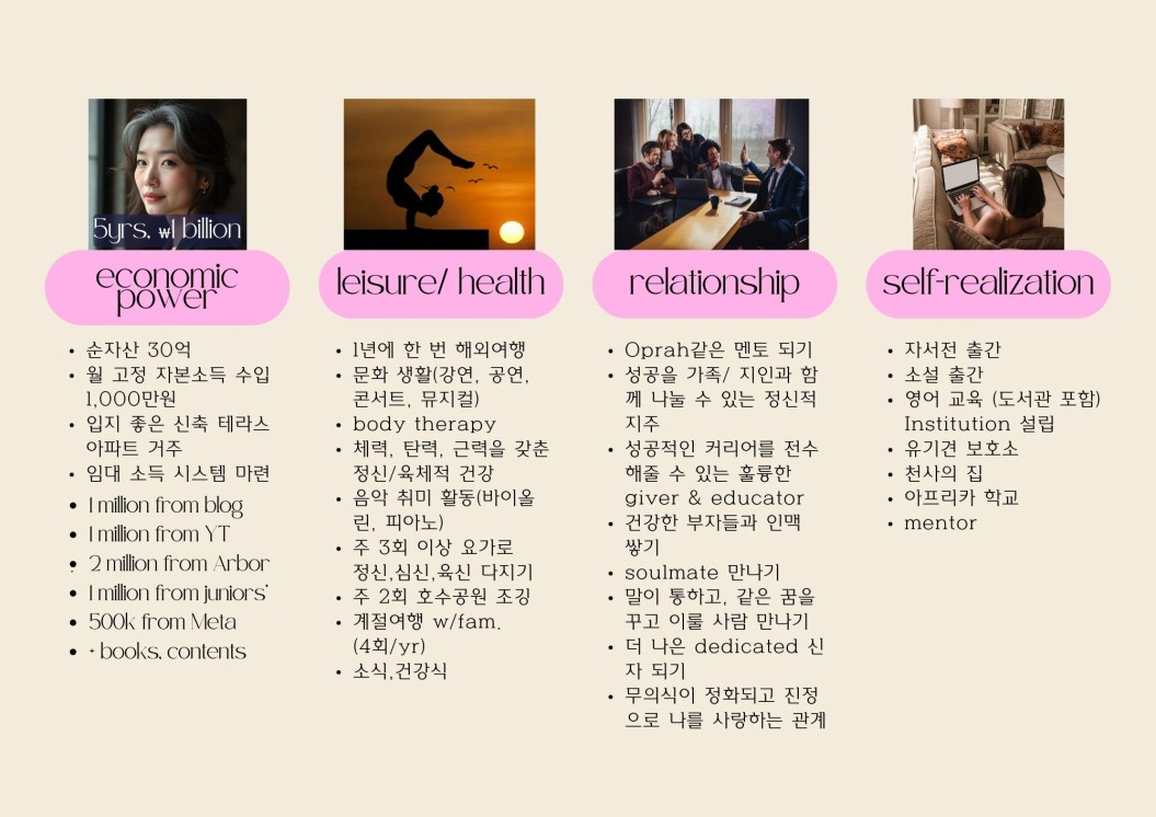 비전보드 실현을 위해 5년 단위로 20년 계획을 세워봅시다. (2025/ 2030/ 2035/ 2040/ 2045년)