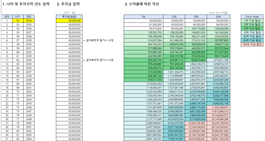 목표 금액 41.6억 (현재 나이 52세, 연저축액 3000만원에서 시작)