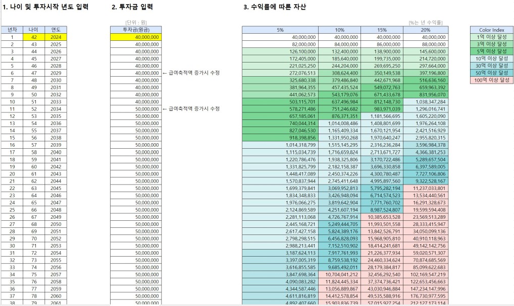목표 금액 39.8억 (현재 나이 42세, 연저축액 1800만원에서 시작)