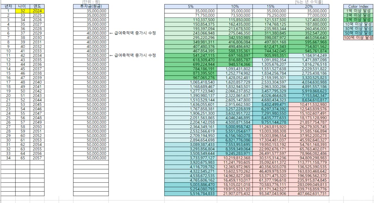 목표 금액 41.6억 (현재 나이 33세, 연저축액 3000만원에서 시작)