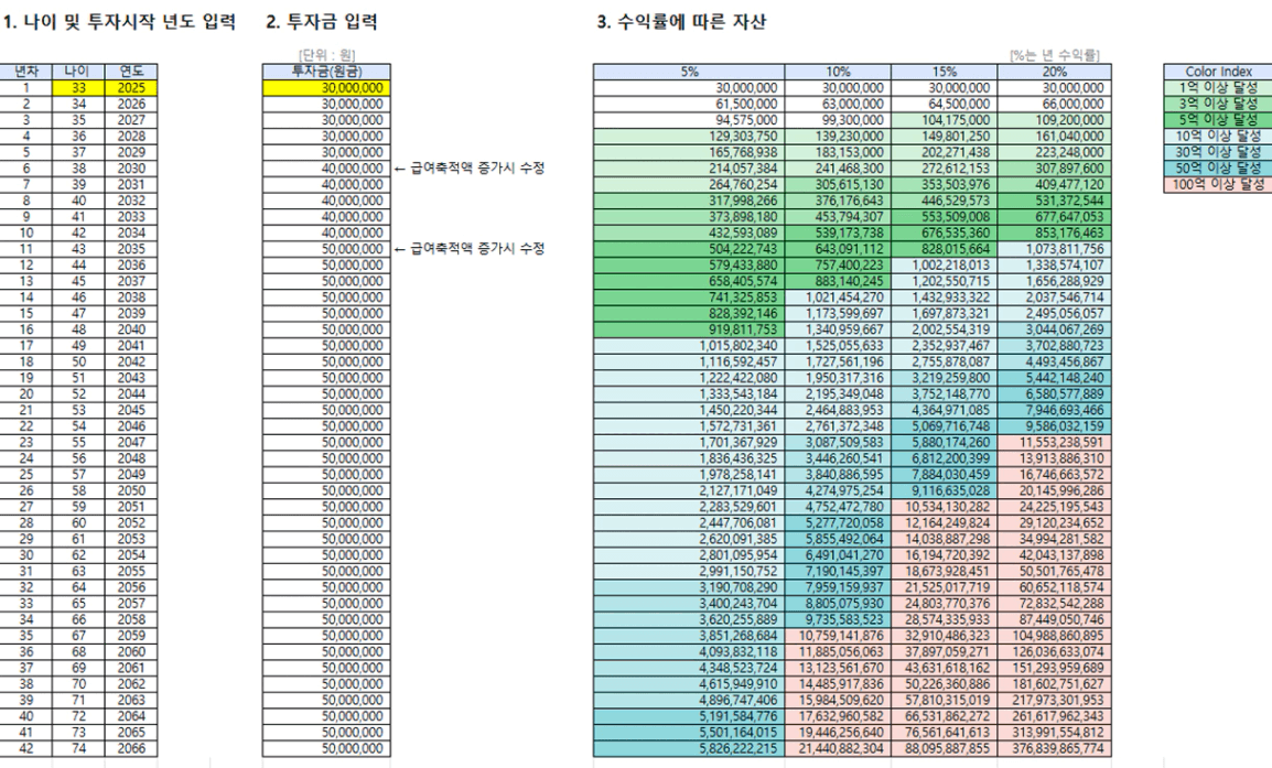 목표 금액 24억 (현재 나이 33세, 연저축액 3000만원에서 시작)