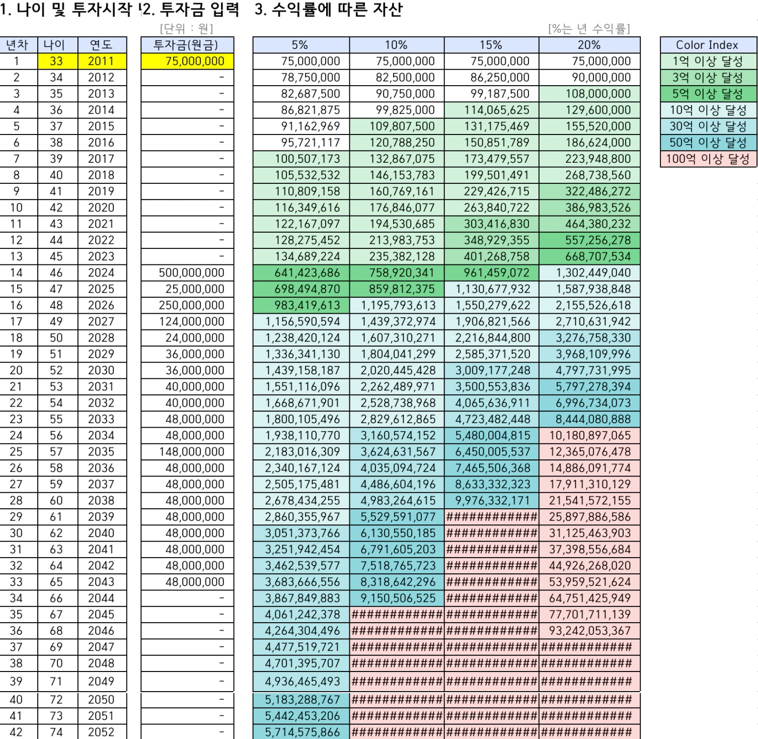 목표 금액 54억 (현재 나이47세, 33세 1호기 7.5천만원에서 시작)