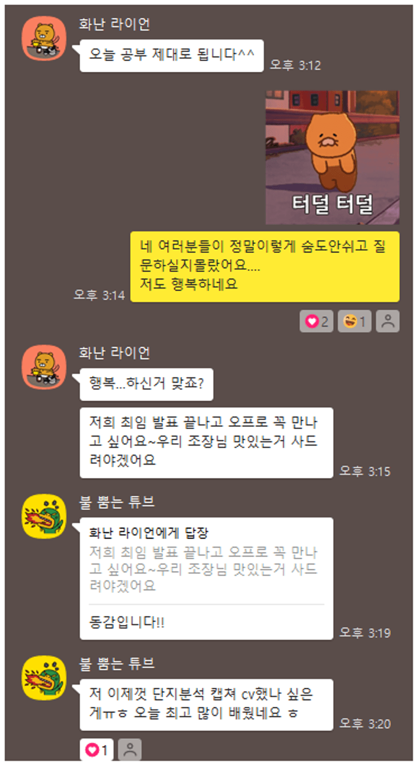 이번 한달 고생 많으셨습니다! 이번 지기반 잘 마무리 할 수 있도록 하겠습니다!