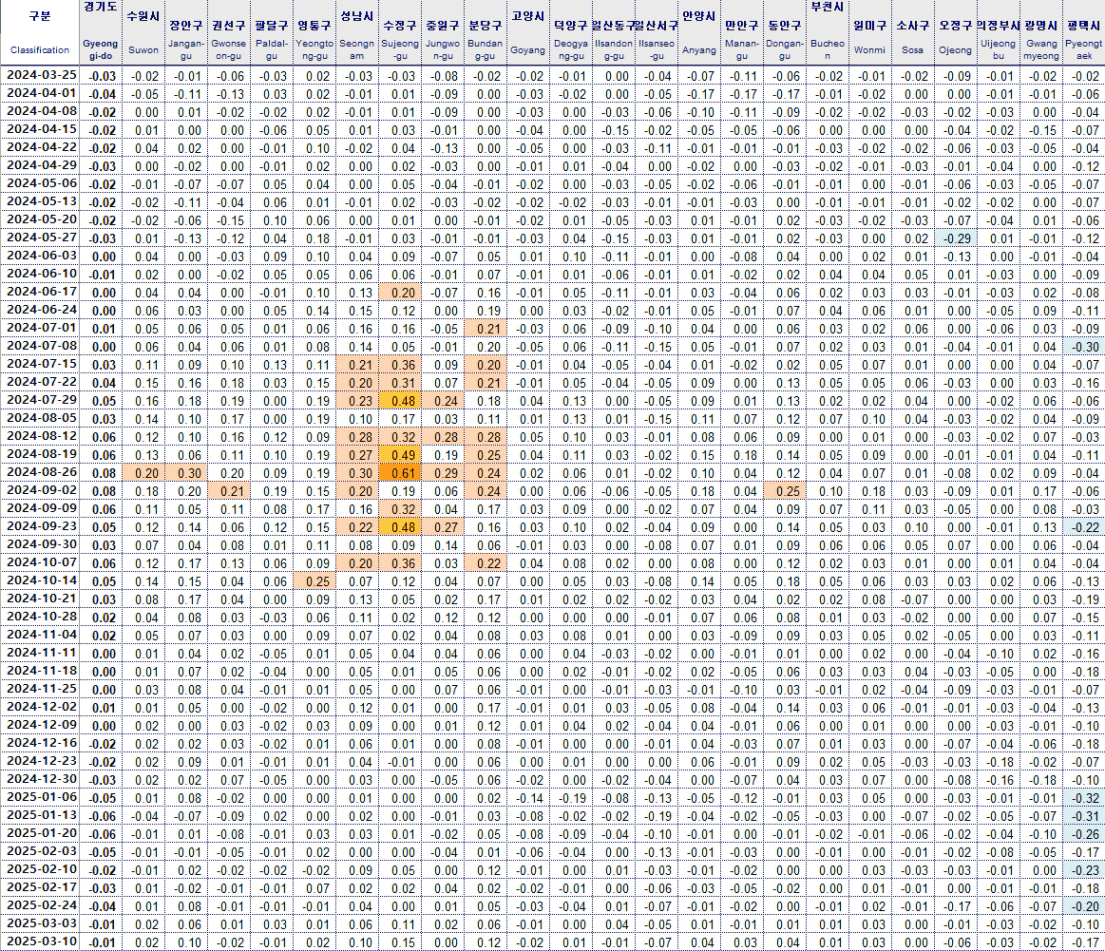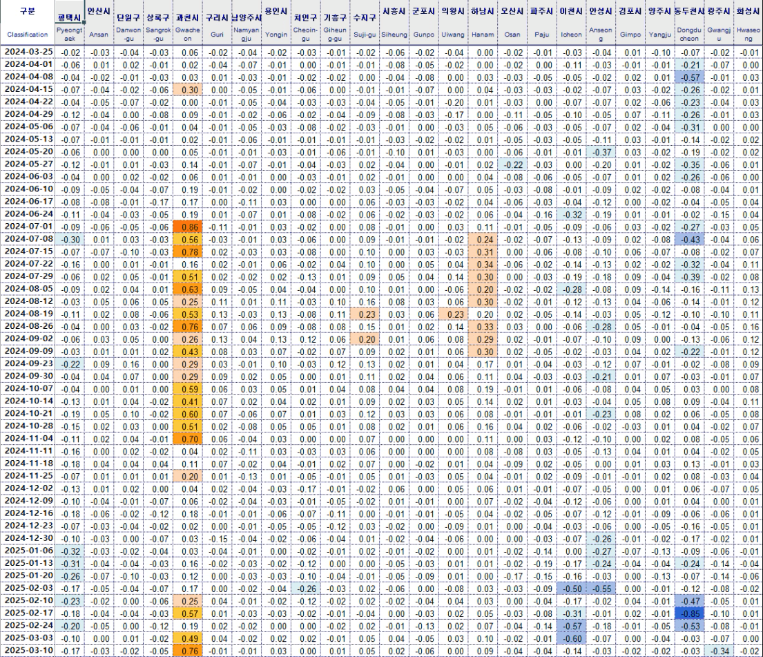 대전 -0.03%, 울산 0.01%, 광주 -0.02% 로