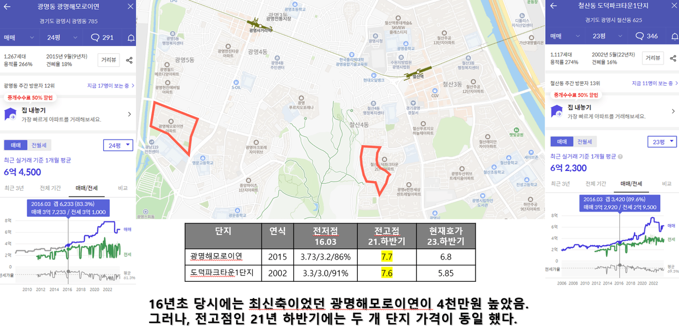 저저점이었던 시기에는 신축이었던 광명해모로이연이 3.7억으로 도덕파크타운보다 4천만원정도 높았는데