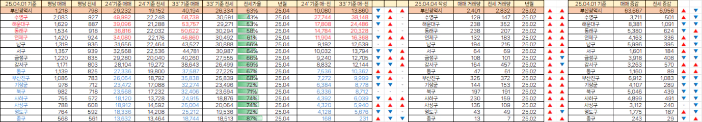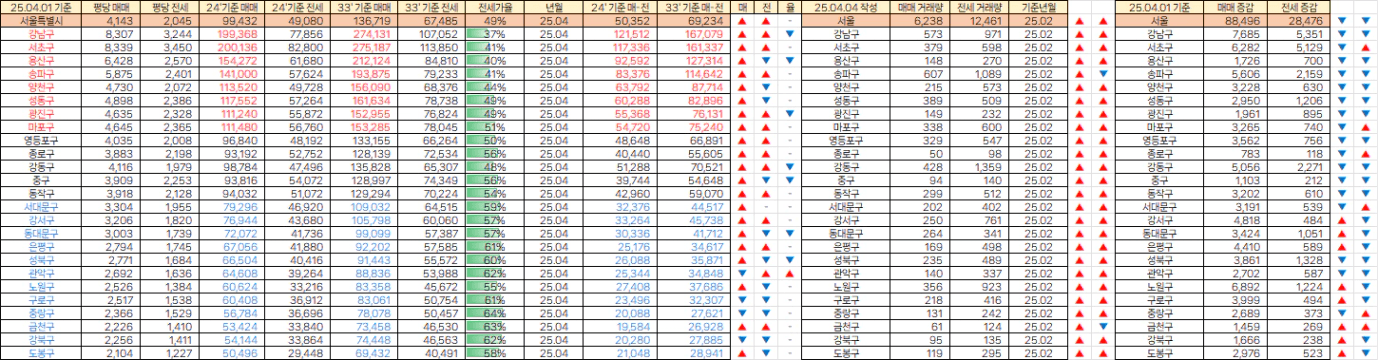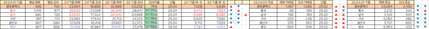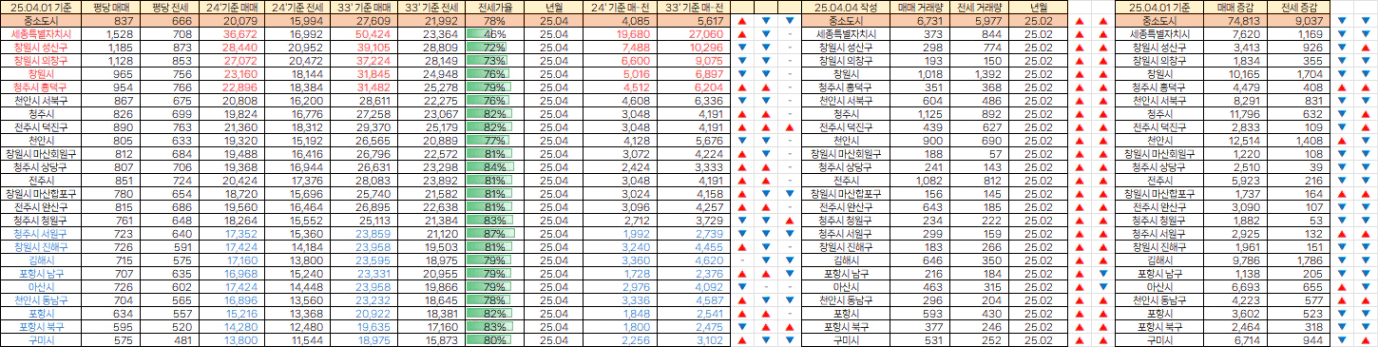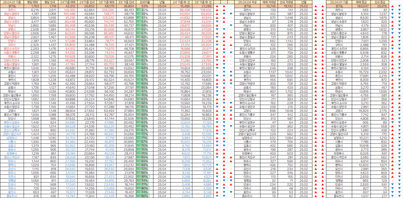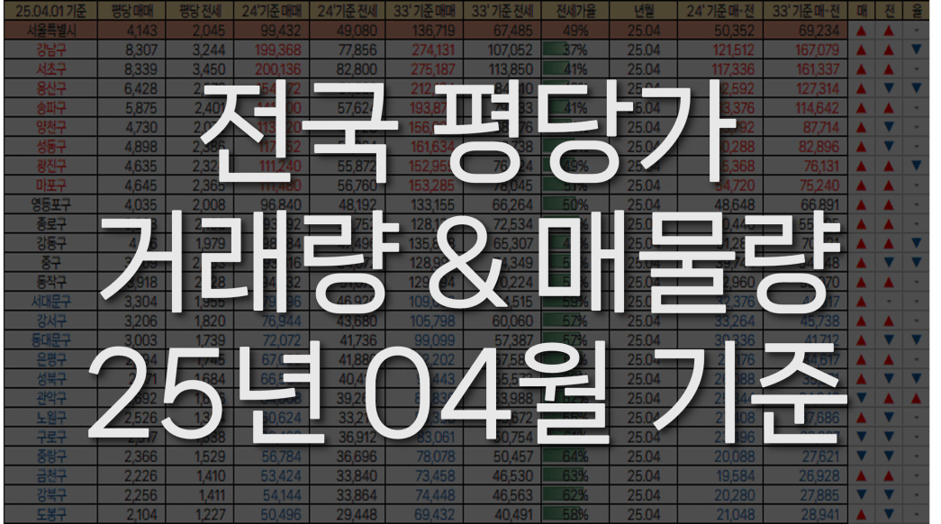 [빙바나나] 전국 시세. 25년 4월 평당가 / 거래량 & 매매,전세 매물량 (25.04.04)