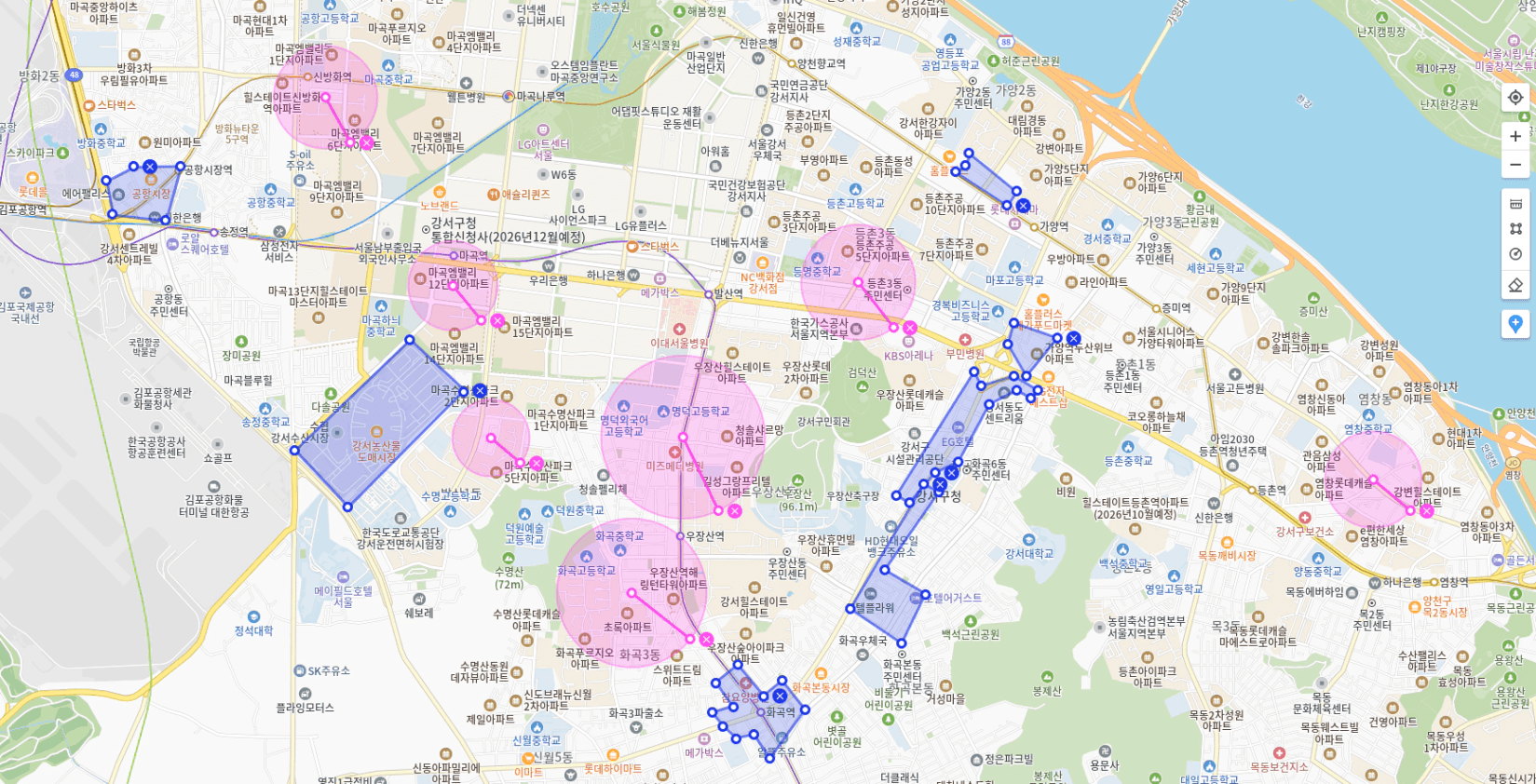학원가 클릭 → 오른쪽 화면처럼 밀집된 학원가 표시 됨